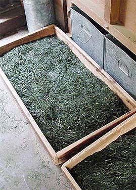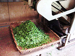 | 同じ「茶の樹」から作られる、緑茶と紅茶、どうして出来上がりの色が違うのでしょう。緑茶が緑色なのは、植物としての重要な成分が関係していたのです。 写真は、水窪で茶摘みをしたときのものです。 |