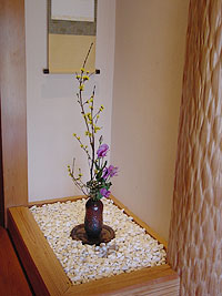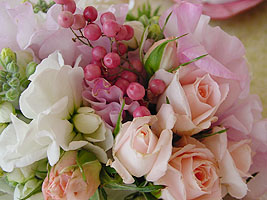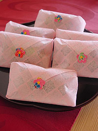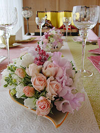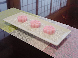 | 緑・白・ピンクと3色のペーパーアイテムを使っての飾り。桜のキャンドルがいい香りを放っていました。 |