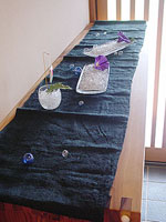 | 佐倉先生の手にかかるとこんなにステキに!!! 以前のお正月レッスンで実習した「あわじ結び」、お正月のお箸袋だけかと思ったら、 こんなところで、こんなに涼しげに表現できるんですね。 本当に本当にステキでした。 |