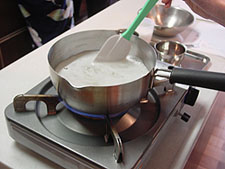 | 今回も、和服、浴衣でいらした方々、みなさん本当にステキでした。ありがとうございました。普段和服の方は浴衣に、浴衣を和服風に、いろいろな着方を楽しめました。 和菓子の実習の時には割烹着を着た方もいらっしゃいました。いいものですね〜。 |