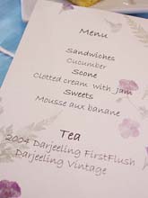 ティータイムはアフタヌーンティーのイメージで。紅茶のお土産だって、こだわってラッピングしましたよ。メニューも飾って本格的。